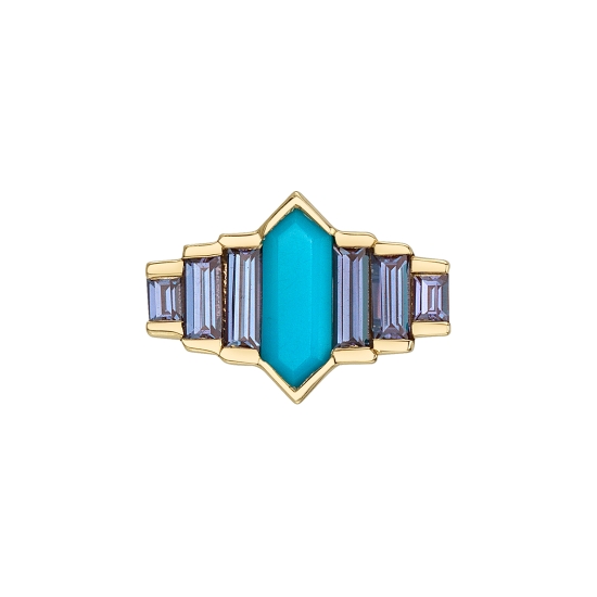 Pictured in yellow gold with Turquoise and Chatham Alexandrites