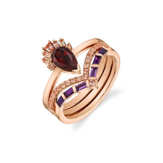 Custom wedding set featuring an 8x5mm Garnet pear with Chatham Champagne Sapphire accents and a gradient of Amethyst baguettes