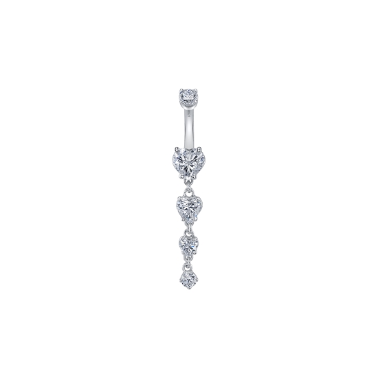 Curved barbell with 3mm round prong top and 5mm heart prong bottom with graduating heart prongs and a round prong dangle