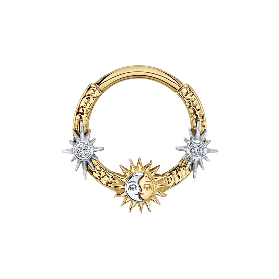 Hammered celestial hinge ring with sun, moon, and tiny north stars with 1.25mm bezels