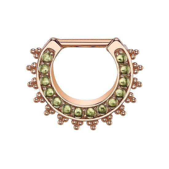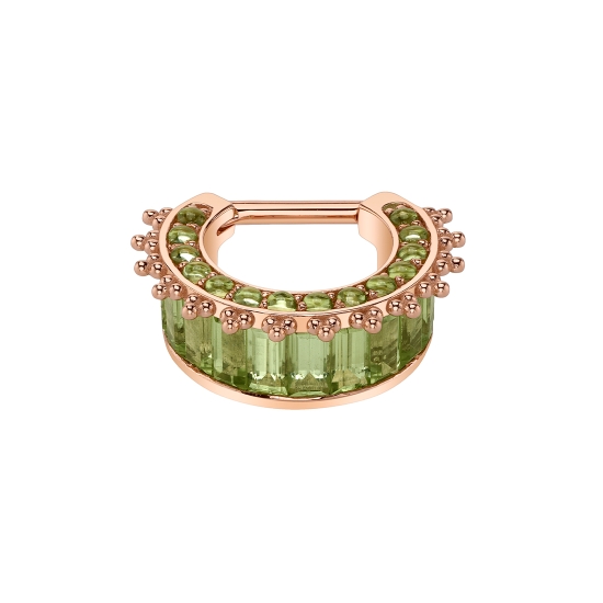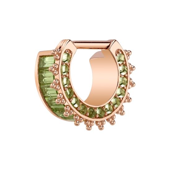 Pictured in rose gold with a straight hinge, round Peridot cabochons, and faceted Peridot baguettes