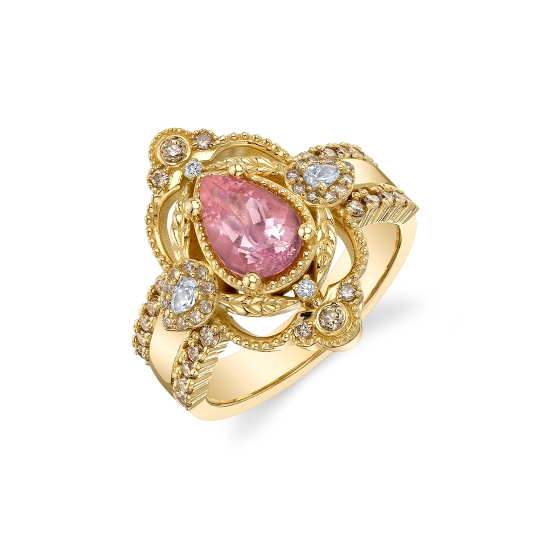Vintage-inspired ring with 9x6mm pear center, leafy details, pear halos on shoulders, and round accents